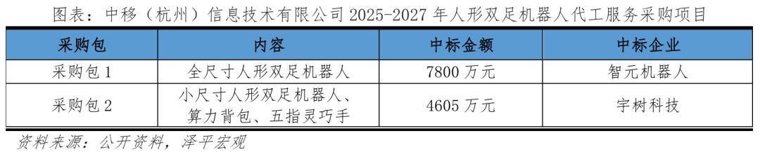 今年,我国人形机器人企业的商业服务场景订单迎来了初步爆发。2025年6月,智元机器人和宇树科技共同中标中移(杭州)信息技术有限公司2025年至2027年人形双足机器人代工服务采购项目,预期将用于营业大厅的客户接待等营销类场景;中标金额1.24亿元,目前在国内人形机器人企业订单中是较大的一笔。
